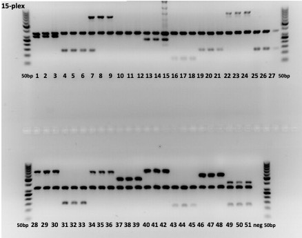 Figure. Multilex-PCR experiment demonstrating the specificity of primers designed for each MLST type (groups of three). The universally present middle lane represents the signal from a universal Listeria-specific primer pair used as a positive control. Data from Andreson et al., 2026.